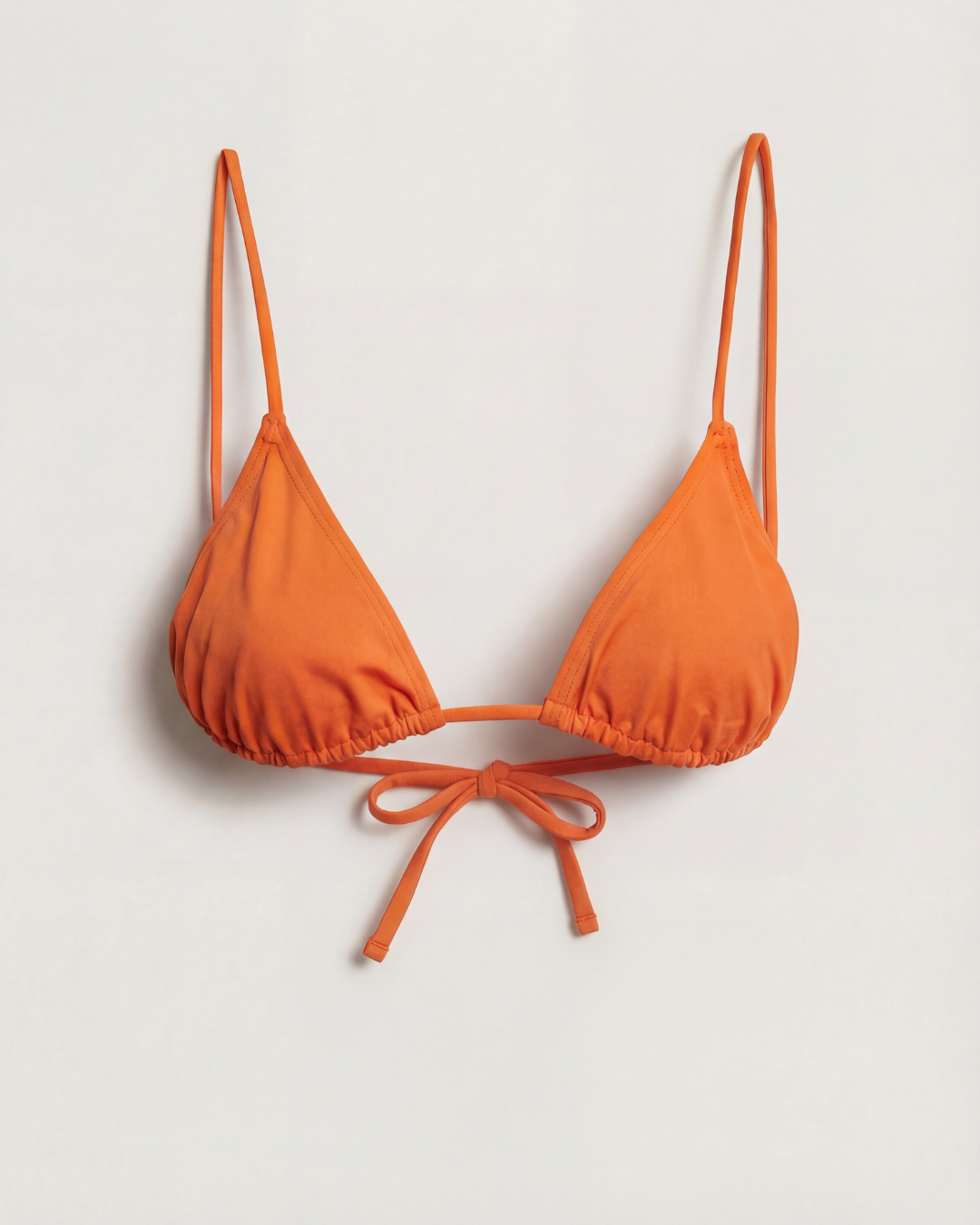 The Coco Bikini Top features a classic triangle design, complete with slender straps and adjustable self-tie straps at the back for a customized fit. It is crafted from soft, fast-drying sustainable materials for added comfort and sustainability. Paprika Orange is a bold, classic shade of orange.